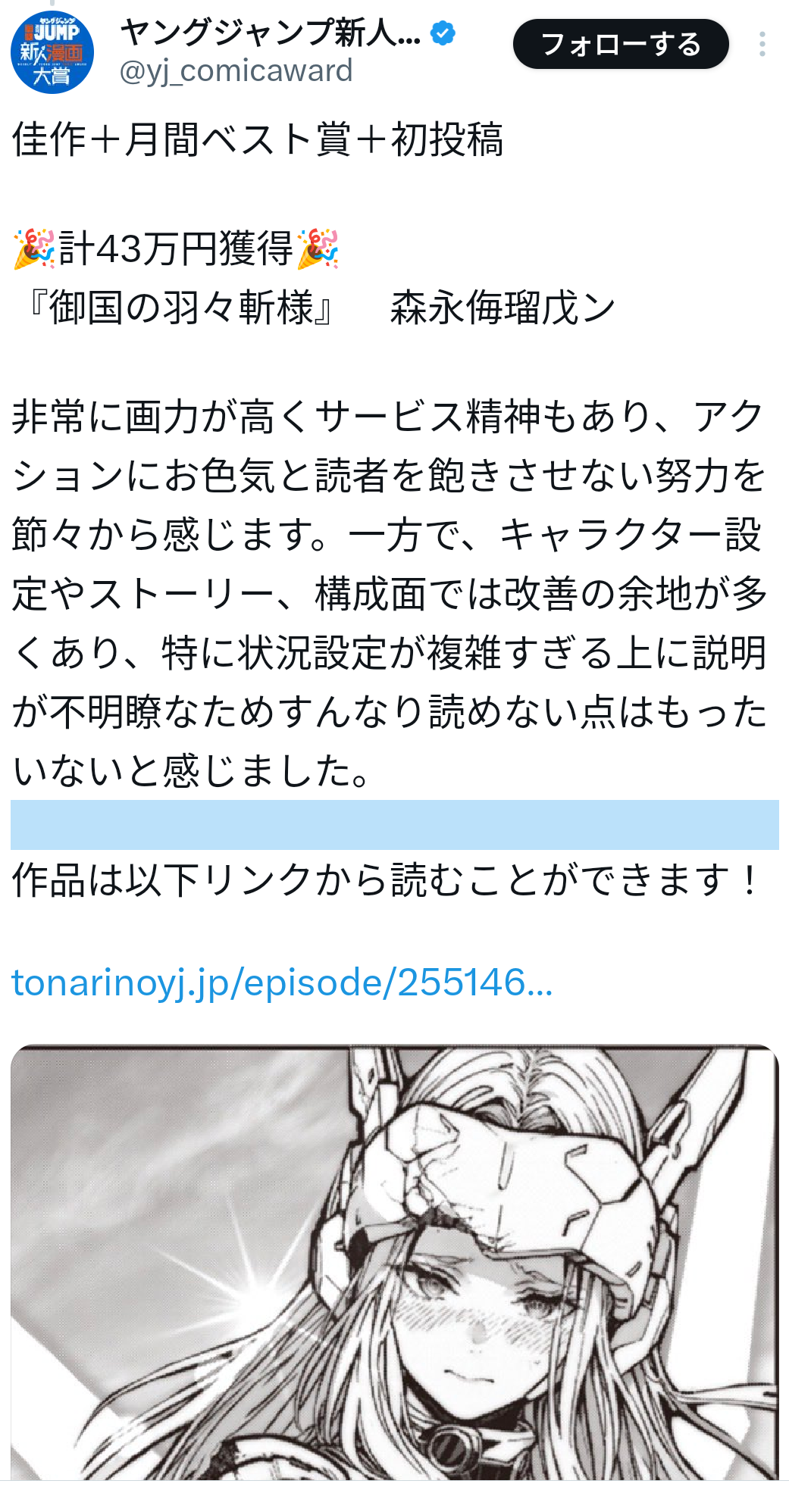 | … | 12無念Nameとしあき25/11/26(水)15:59:20No.1368884538そうだねx20>これがAIだとしたらAIでも雑誌の賞を取れるくらい面白い漫画が描けることが証明されるな |