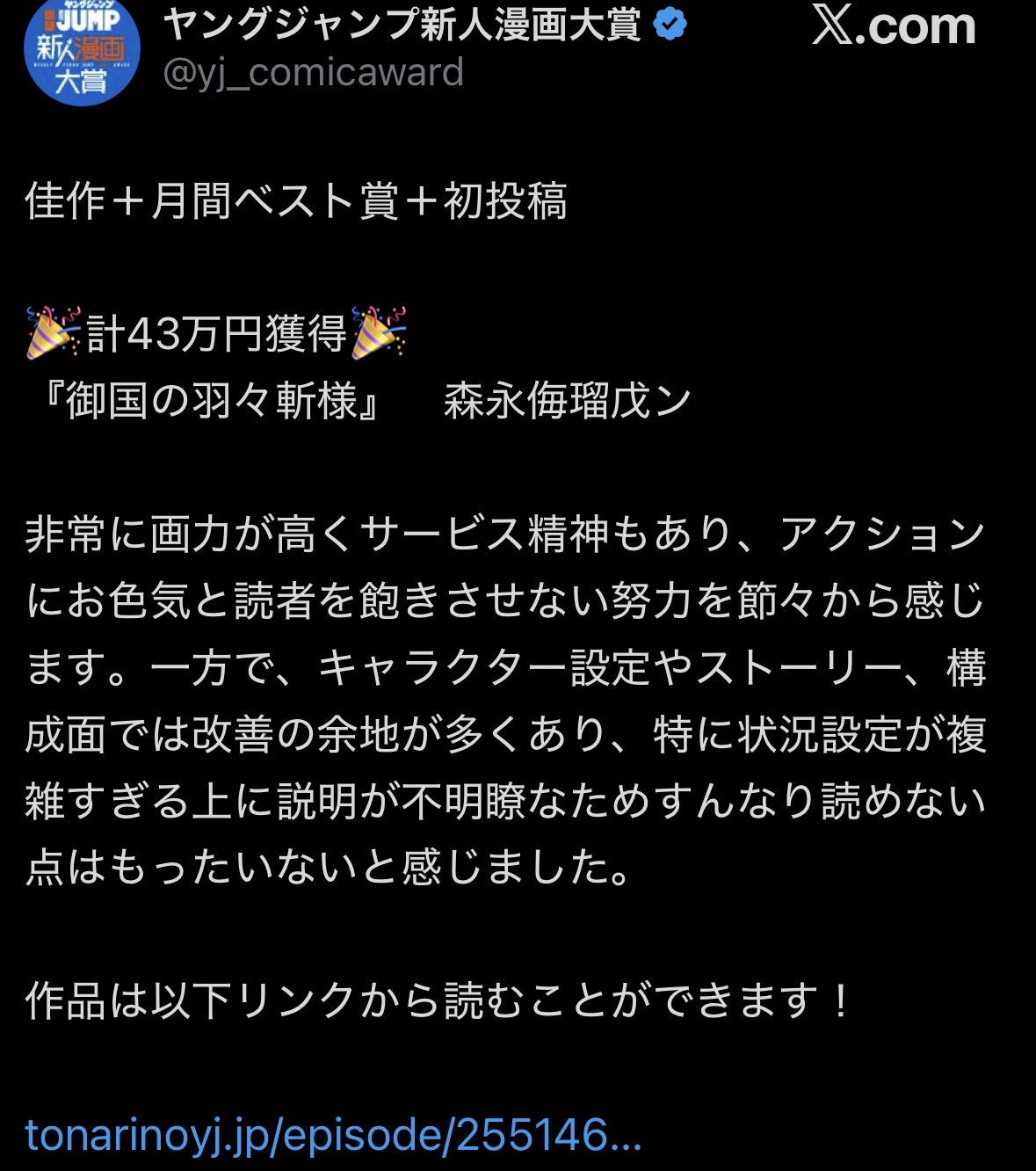 | … | 903無念Nameとしあき25/11/26(水)18:41:37No.1368915759そうだねx1>連載の義務はないんだから受賞して金だけ取るの大いに結構じゃないか |