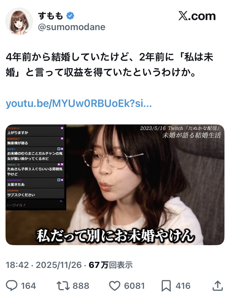 | … | 48無念Nameとしあき25/11/26(水)20:32:30No.1368947820そうだねx1>結婚黙ってるってアイドルポジだったの? |