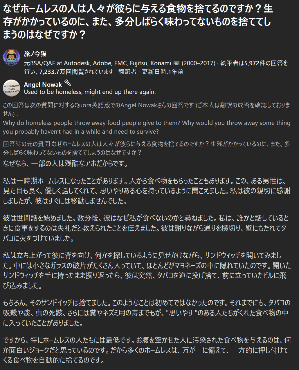 | … | 24無念Nameとしあき25/11/26(水)19:39:47No.1368931626そうだねx19貧しい人に食べ物恵んで優しくしてあげたら |