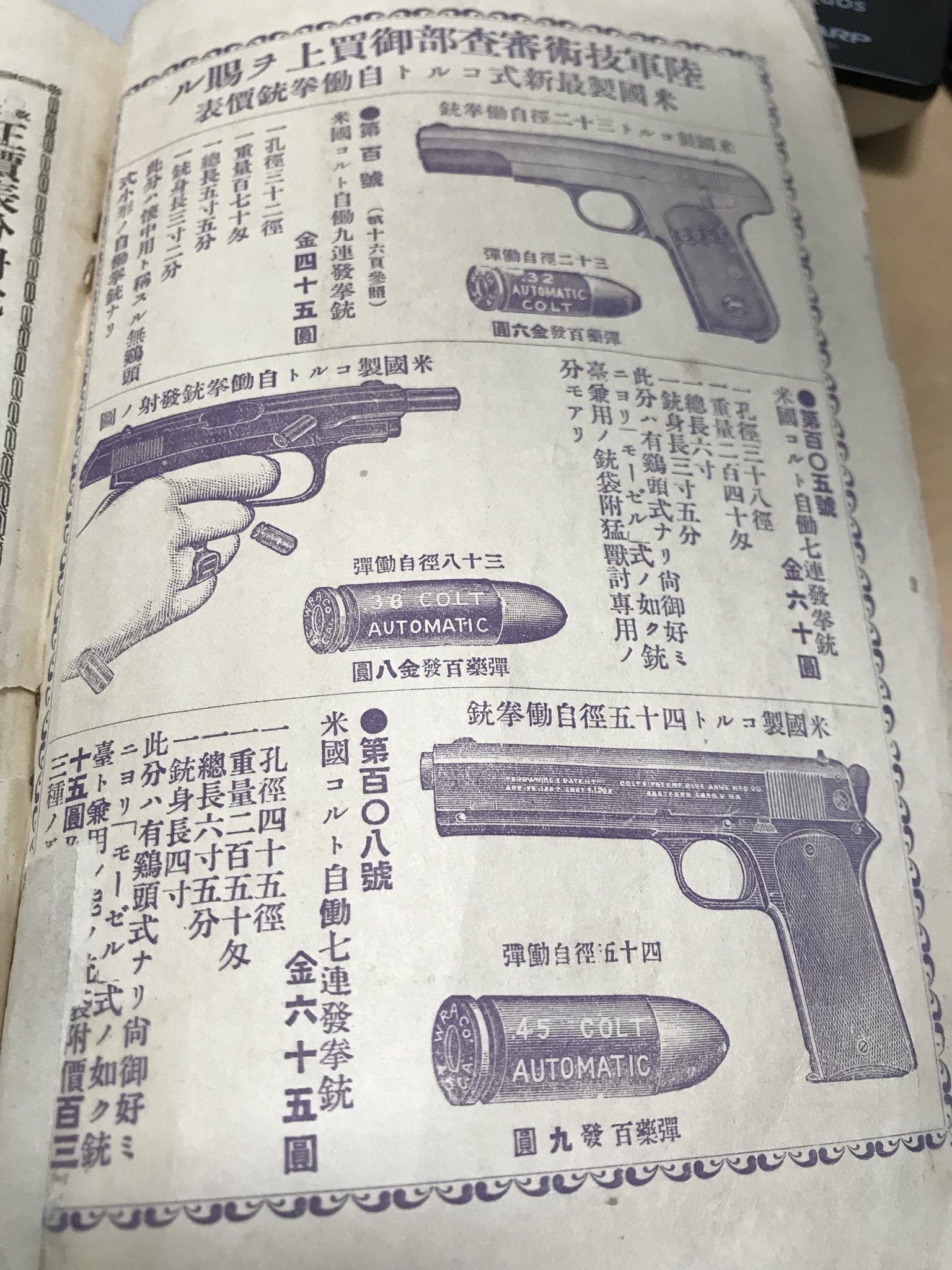 | … | 135無念Nameとしあき25/11/26(水)23:07:21No.1368992627そうだねx1 1764166041954.jpg-(510934 B) 大正2年の日本銃砲店通販カタログに掲載されてるコルトM1905もしくはM1907 |