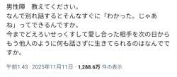 男性陣 教えてください。 なんで別れ話するとそんなすぐに「わかった。じゃあね」ってできるんですか。 今までどえろいせっくすして愛し合った相手を次の日からもう他人のように何も話さずに生きてられるのはなんでですか。